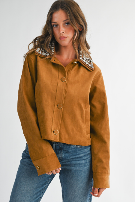 Nuestra chaqueta Dakota combina elegancia y actitud. Confeccionada en un suave material tipo ante color marrón cálido, destaca por su espectacular cuello adornado con cristales brillantes , ideal para realzar cualquier outfit de día o de noche. Su corte recto, botones metálicos y mangas amplias te ofrecen una silueta moderna y relajada.