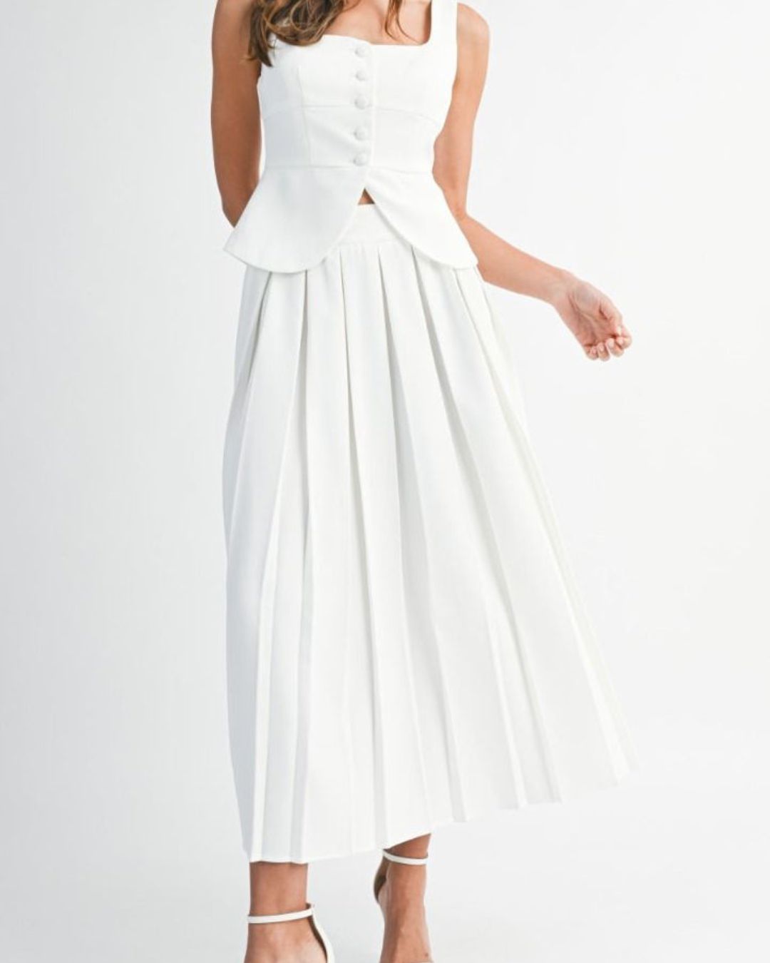 Su top estructurado realza la silueta con delicadeza, mientras la falda de caída amplia aporta movimiento, ligereza y una presencia impecable en cada paso.