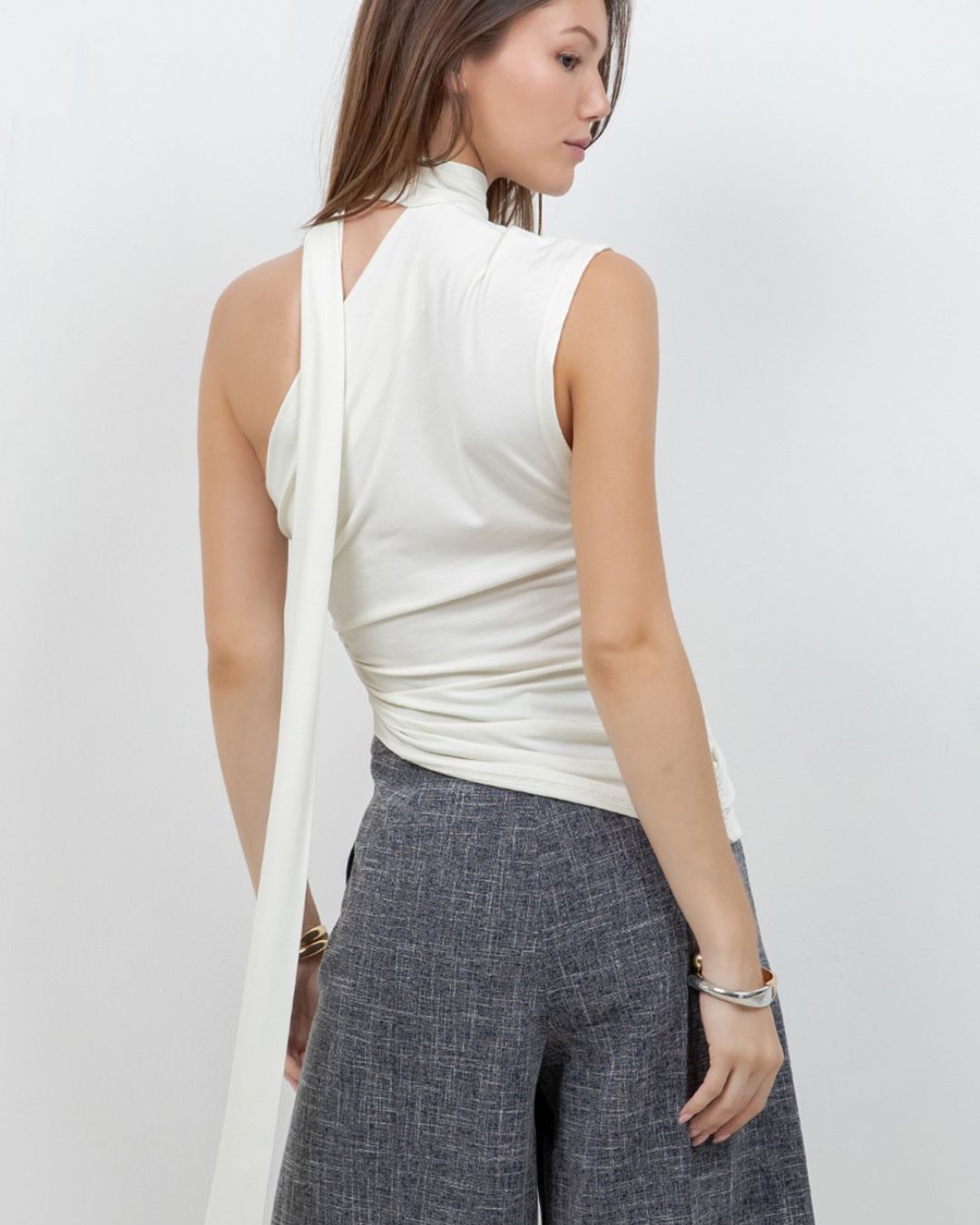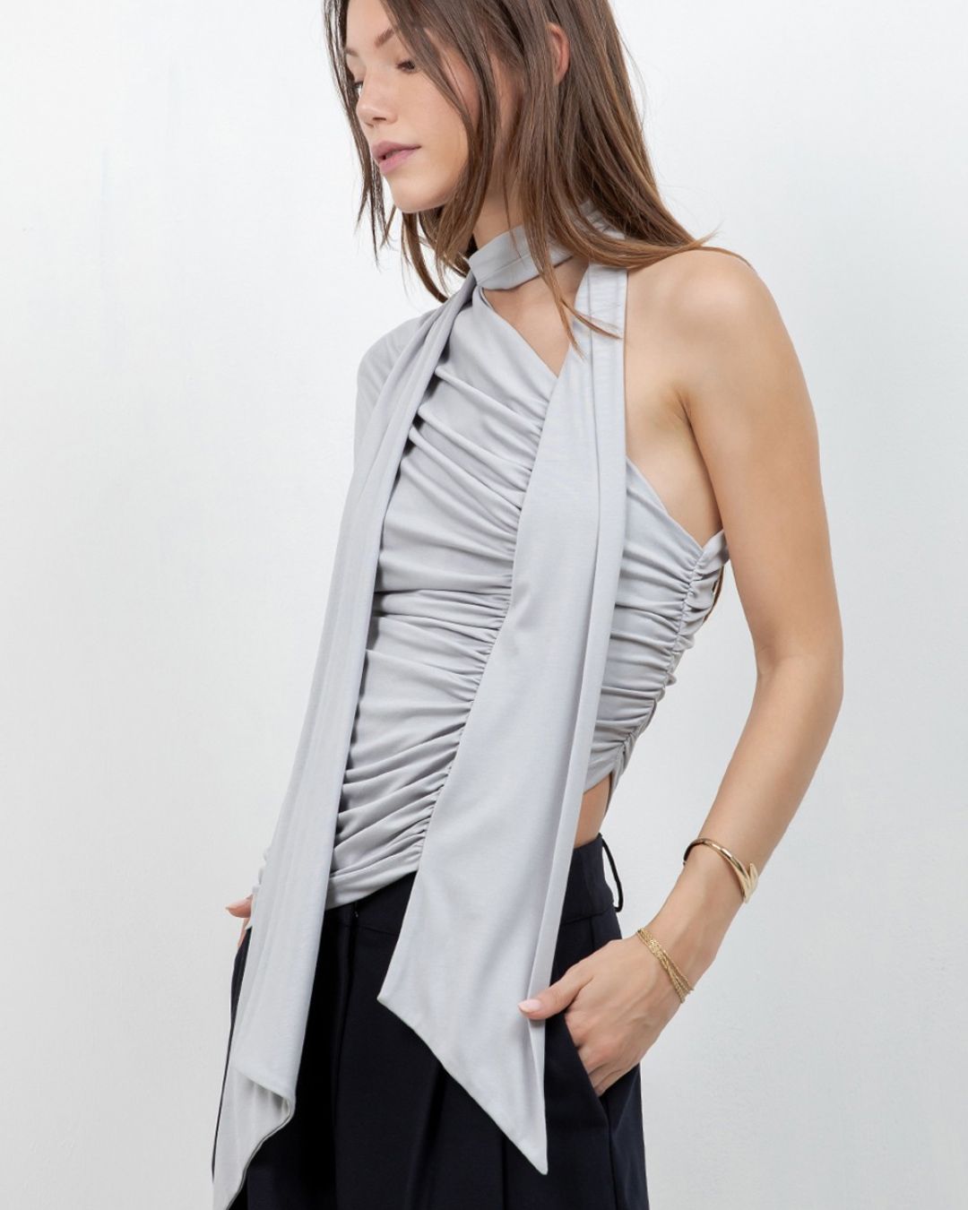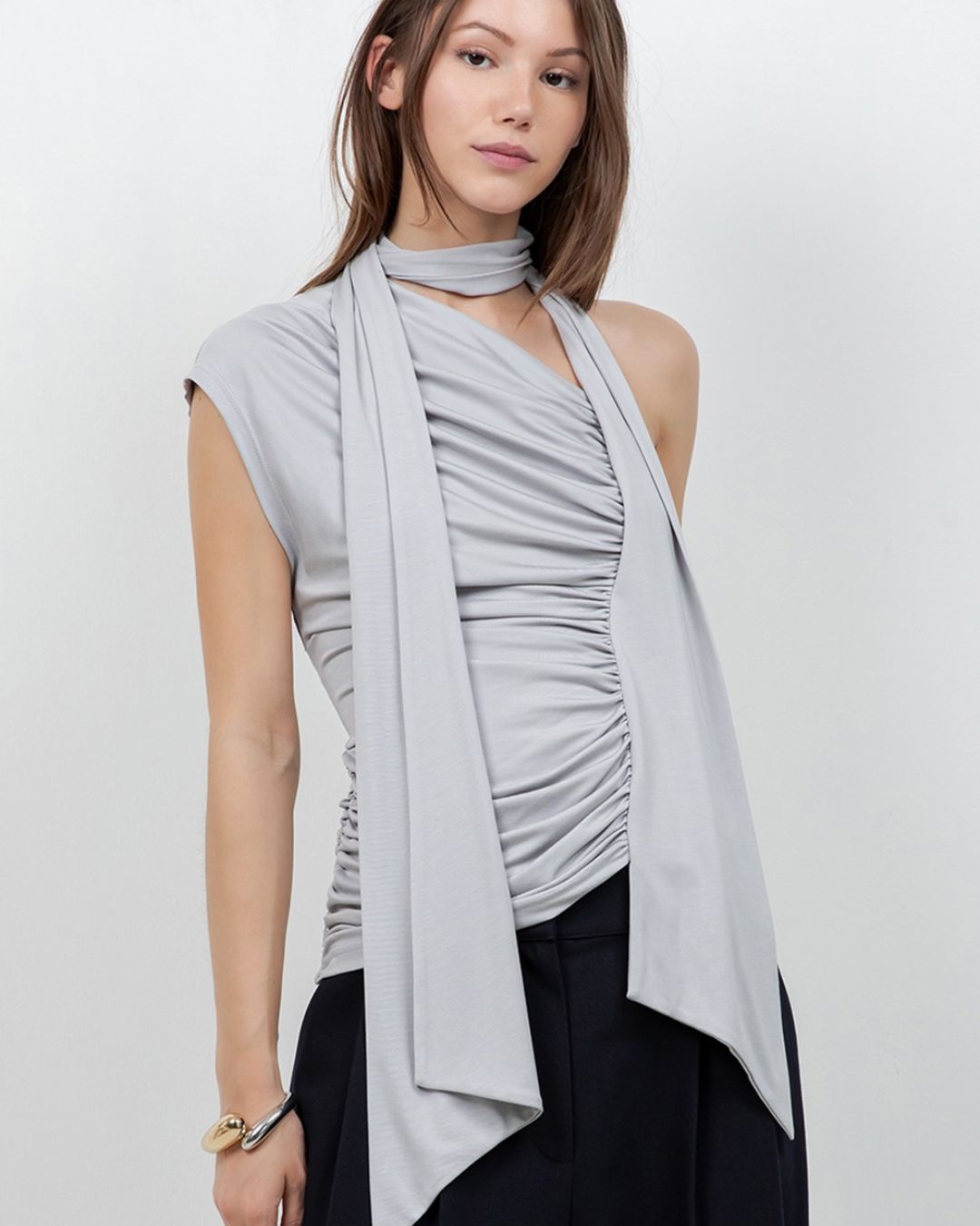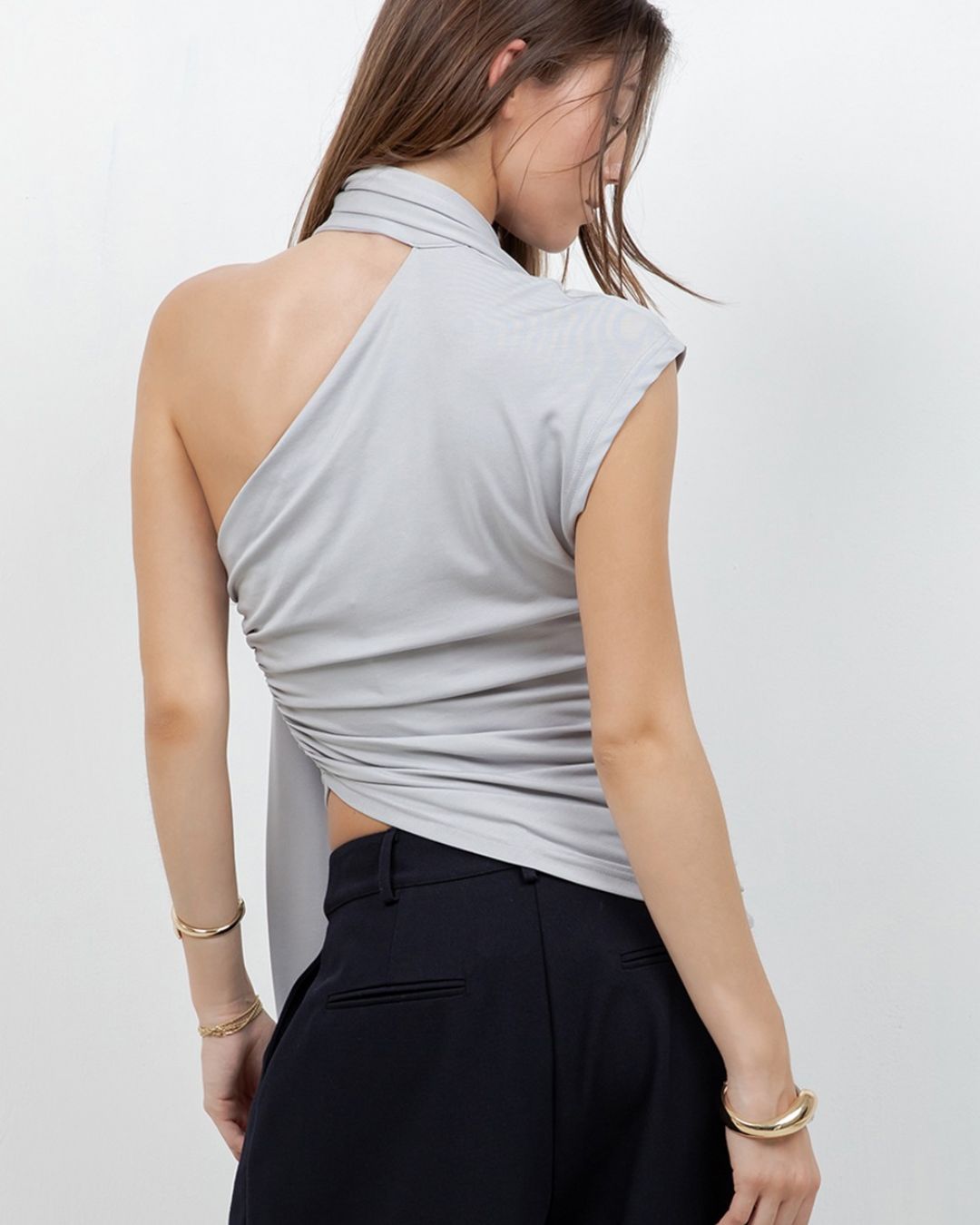 Una pieza que roba miradas. Este top en diseño asimétrico combina drapeados estratégicos que moldean la figura con un elegante lazo que cae con sutileza, creando un efecto sofisticado y moderno.