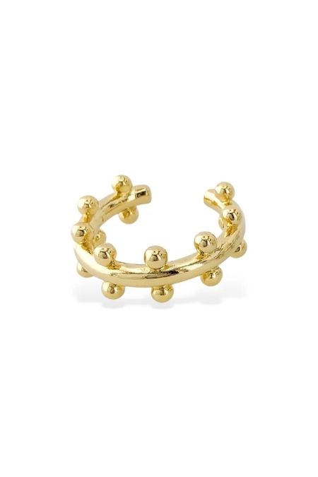 Una sortija dorada con diseño moderno y texturizado de bolitas que resalta por su originalidad y estilo contemporáneo.