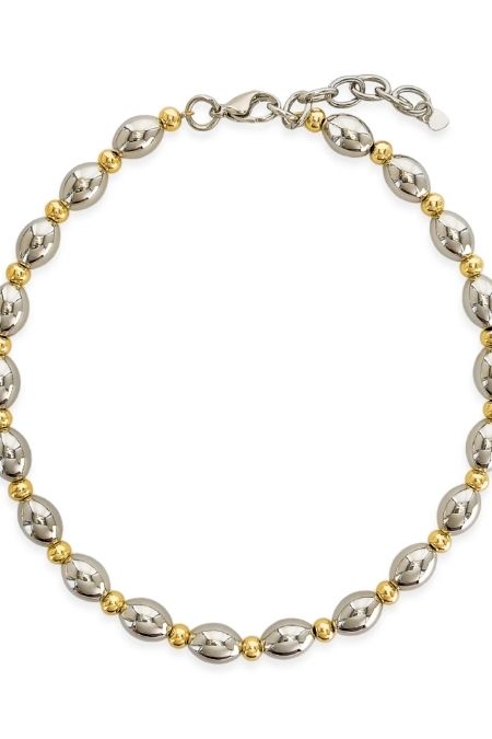 Este collar de cuentas ovaladas en tonos plateado y dorado combina a la perfección, elegancia y estilo moderno. Su diseño llamativo, pero clásico, lo hace ideal para elevar cualquier look, desde uno casual hasta uno más sofisticado. ✨