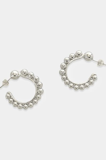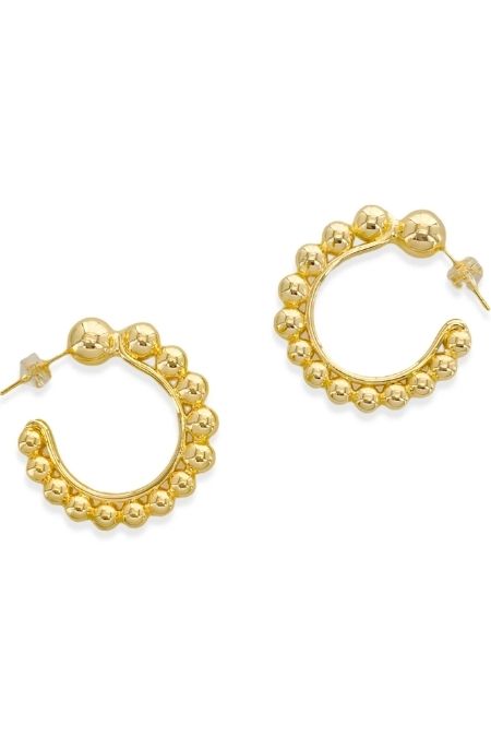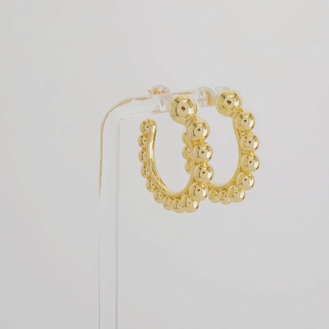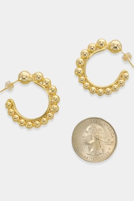 Luce un estilo único con estos encantadores aretes de aro con diseño de cuentas y cierre a presión, realzados por llamativas esferas doradas. Desliza el poste del arete en tus orejas y fíjalo con el cierre a presión.