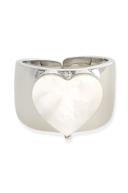 Una joya que enamora por su sencillez y brillo. Esta sortija cuenta con un elegante corazón de nácar montado sobre un aro ancho con baño en oro 18K o baño en rodio, ideal para quienes buscan una pieza con estilo y significado. Su diseño liso y sofisticado permite combinarla tanto para el día como para la noche.
