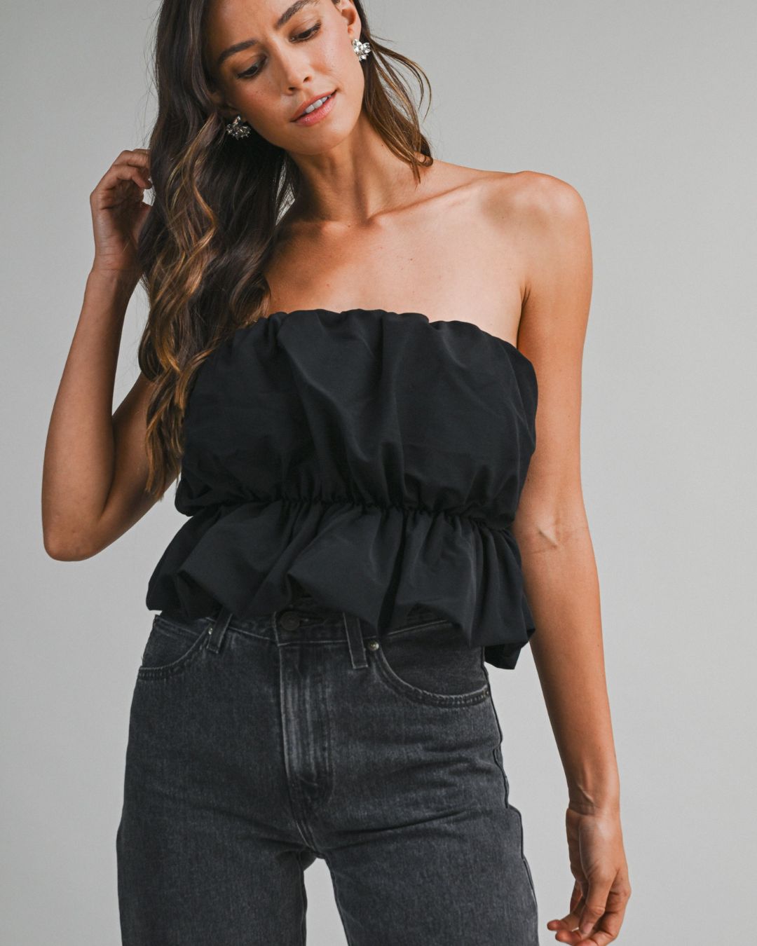 ¡Pura elegancia con un toque de coquetería! Este top tipo bandeau sin tirantes destaca por su diseño con volantes que añade textura y feminidad, perfecto para lucir hombros y espalda con estilo. 👗✨