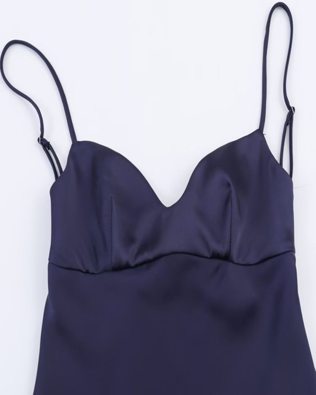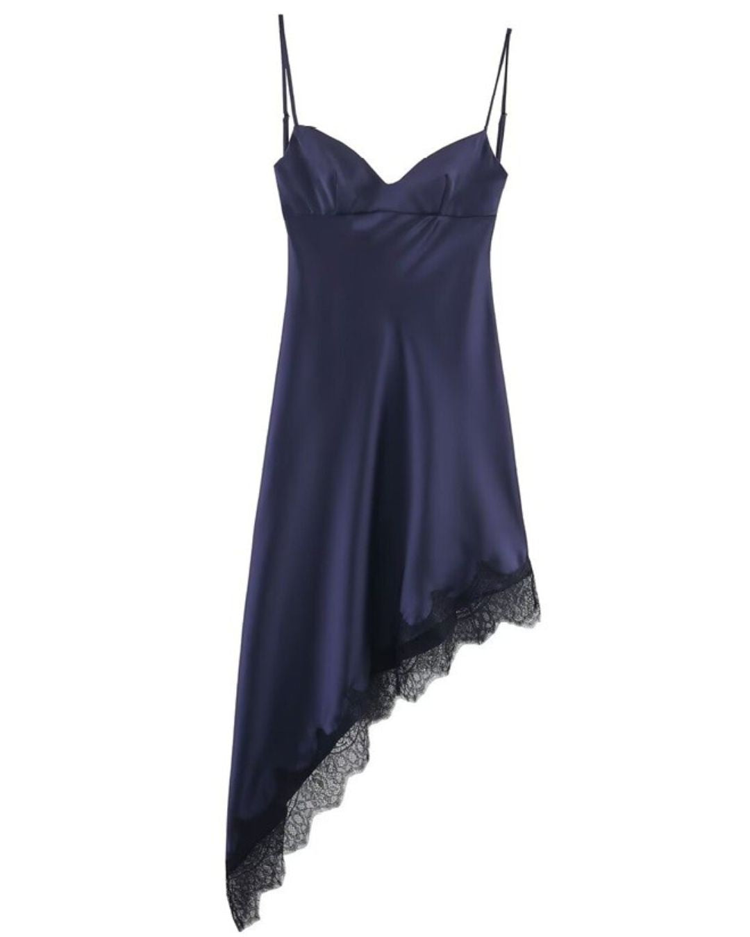 Este traje satinado con caída asimétrica y delicado encaje te hará sentir bella y segura.